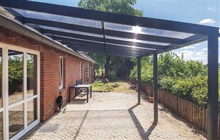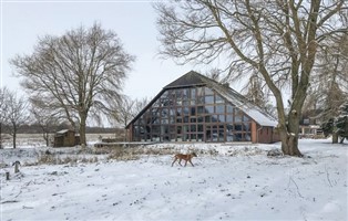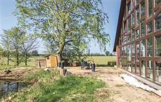 Die gesamte Vorderseite des Hauses ist zu einem „Fenstermosaik“ gestaltet worden und bietet eine fantastische Aussicht auf die umliegende Natur. Wild, Hasen und Raubvögel gehören zum Schauspiel dazu. Auf der linken Seite des Hauses befindet sich eine überdachte Terrasse mit wunderbarer Aussicht. Auf der Terrasse vor dem Haus schauen Sie direkt auf den Teich mit Vögeln und Fischen. Hier finden Sie auch gemütliche Gartenmöbel und somit Platz für gemeinsame Mahlzeiten mit der ganzen Familie.