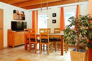 Ferienhaus (Auf einer Insel, In einem Wohngebiet oder im Zentrum (Dorf), barrierefrei) , 103 m² Wohnfläche, 3 Schlafzimmer, 2 Badezimmer, für 6 Personen. Parterre: (offene Küche (Esstisch (6 Personen), Wasserkocher, Toaster, Kochherd (4 Kochplatten, Ceranfeld), Dunstabzugshaube, Kaffeemaschine, Backofen, Mikrowelle, Spülmaschine, Kühlschrank (+ Gefrierfach)), Wohn/Esszimmer (TV (Satellit), Radio, CD-Spieler, Heizung (elektrisch), Heizung (Fußbodenheizung)), Schlafzimmer (Doppelbett), Badezimmer (Dusche (ebenerdige Dusche), Waschbecken, Toilette, Waschmaschine), Flur)