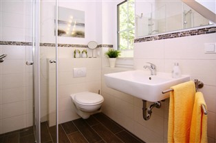 Ferienhaus (In einem Wohngebiet oder im Zentrum (Dorf)) , 84 m² Wohnfläche, 3 Schlafzimmer, 2 Badezimmer, für 6 Personen. Parterre: (Badezimmer (Dusche, Waschbecken, Toilette, Föhn))