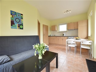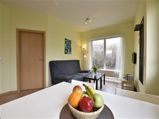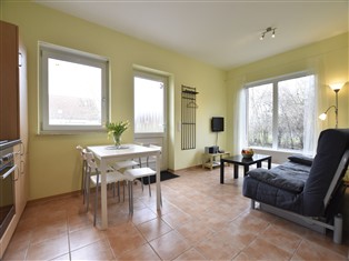 Ferienwohnung (In einem Wohngebiet oder im Zentrum (Dorf)) , 32 m² Wohnfläche, 1 Schlafzimmer, 1 Badezimmer, für 3 Personen. Parterre: (offene Küche (Wasserkocher, Toaster, Kochherd (Ceranfeld), Kaffeemaschine, Backofen, Kühl-/Gefrierkombination), Wohn/Esszimmer (Doppelschlafcouch, TV (Flatscreen), Esstisch (4 Personen), Sitzecke, DVD-Spieler, Radio, CD-Spieler), Schlafzimmer (Doppelbett king size (180 x 200 cm)), Badezimmer (Dusche (ebenerdige Dusche), Waschbecken, Toilette))