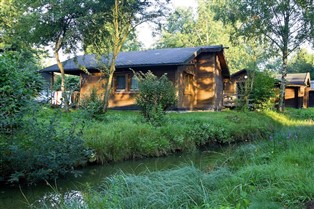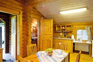 Ferienhaus (Auf Ferienpark) , 45 m² Wohnfläche, 2 Schlafzimmer, 1 Badezimmer, für 3 Personen. Blockhütte: (Wohn-/Schlafzimmer (TV, Radio), Schlafzimmer (Einzelbett, Einzelbett), Schlafzimmer (Einzelbett, Einzelbett, Etagenbett))