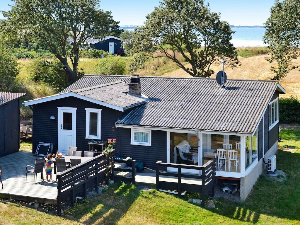 Auf der Halbinsel Langø, nördlich von Kerteminde, findet man dieses Ferienhaus mit schönem Ausblick in Richtung Ostsee. Das Holzhaus liegt quasi umgeben vom Wasser, mit nur etwa 185 m zur einen und ca. 300 m zur anderen Küste. Im Inneren des Ferienhauses gibt es einen hellen, offenen Küchen-/Wohnbereich für das Familienleben, mit schönem Ausblick ins Grüne und direktem Zugang zu einer verglasten Veranda und weiter zu einer Holzterrasse im Außenbereich. Die gute Kücheneinrichtung von 2021 umfasst u.a. mit Induktionsfeld, Backofen, Mikrowelle, Kühlschrank (200 l) und Gefrierfach (41 l). Zudem zusätzliche Gefrierkapazität (70 l) nebenan im Schuppen. Das Wohnzimmer ist u.a. mit einem TV mit einigen deutschen Sendern zur Auswahl ausgestattet und es gibt mobiles Internet. Der Holzofen im Haus sorgt bei Bedarf für wohlige Wärme. Es gibt ein größeres Schlafzimmer mit Doppelbett, ein zweites Schlafzimmer mit zwei Einzelbetten und ein drittes mit Etagenbett für zwei Kinder. Außerdem Badezimmer mit Dusche, WC und Fußbodenheizung sowie Gäste-WC im Haus. Im Außenbereich zudem praktische Außenküche mit großem Gasgrill und Edelstahlspüle. Das Ferienhaus liegt auf einem 840 m2 großen Naturgrundstück mit etwas Rasenfläche und einer Schaukel, das direkt an ein großes Naturschutzgebiet grenzt. Die Insel Langø bietet einige schöne Badeufer und ist zudem für ihre landschaftliche Ursprünglichkeit bekannt, in der sich auch zahlreiche Zugvögel wohlfühlen. Einige Landstriche sind während der Brutzeit der Vögel besonders geschützt. Das Angeln nach Meerforellen ist auf Langø sehr beliebt. Ein mitgebrachtes, kleineres Boot (Jolle) kann z.B. im kleinen Hafen Korshavn zu Wasser gelassen werden. Keine Vermietung an Jugendgruppen erwünscht!