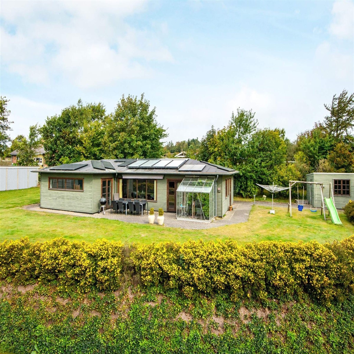 Gut gelegenes und gepflegtes Ferienhaus mit hauseigenem Pool (als einziges in der Gegend) sowie weiteren Freizeitangeboten für die ganze Familie. Liegt in attraktiver Umgebung nur ca. 800 m vom Limfjord mit kinderfreundlichem Strandufer entfernt. Im separaten Poolbereich des Ferienhauses stehen ein Schwimmbecken mit 400 x 400 x 140 cm (L/B/T) und ein Badezimmer mit Dusche und WC zur Verfügung. Zusätzlich gibt es im Haus noch ein weiteres Badezimmer, ebenfalls mit Dusche und WC, bereit. Im separaten Aktivitätshäuschen gibt es Unterhaltung für die ganze Familie, darunter Billard, Tischtennis und elektronisches Darts. Das hell und einladend eingerichtete Ferienhaus ist praktisch eingerichtet und hat einen offenen Küchen-/Wohnbereich für das Familienleben mit direktem Zugang zur Südterrasse des Hauses. Das Wohnzimmer bietet u.a. modernes Mobiliar, freies WLAN und einen Flachbildfernseher mit einigen deutschen Sendern zur Auswahl. Darüber hinaus gibt es Chromecast zum Streamen eigener Anbieter. Im Haus sowohl klimafreundliche Wärmepumpe als auch gemütlicher Holzofen für kühlere Tage. Zur Küchenausstattung gehören u.a. Ceranfeld, Dunstabzugshaube, separater Backofen mit Grill, Mikrowelle, Kühlschrank, Kaffeemaschine und Geschirrspüler. Es gibt eine Waschmaschine und einen Wäschetrockner im Hauswirtschaftsraum. Außerdem sind Hochstuhl und Kinderbett für die Kleinen vorhanden. Es gibt vier Schlafzimmer im Haus; drei mit Doppelbett, das vierte mit einem Etagenbett mit zwei Kojen. Außen findet man eine offene Terrasse mit guten Gartenmöbeln und einem Gasgrill für sonnige Tage. Zudem gibt es Platz für spielende Kinder, für die Fußballtor, Schaukeln/Rutschen und einen Sandkasten vorfinden. Darüber hinaus gibt es auch eine Feuerstelle, an der die Familie sich beim Rösten von Marshmallows, Würstchen oder Stockbrot vergnügen kann. Auf dem nahe gelegenen Campingplatz gibt es im Sommer Einkaufsmöglichkeiten, eine Cafeteria und die kostenlose Möglichkeit, den Spielplatz und die Hüpfburg des Campingplatzes zu nutzen. Das Haus liegt nur ca. 1,5 km vom Golfplatz Struer entfernt (mit Pay-and-Play) Keine Vermietung an Jugendgruppen erwünscht!