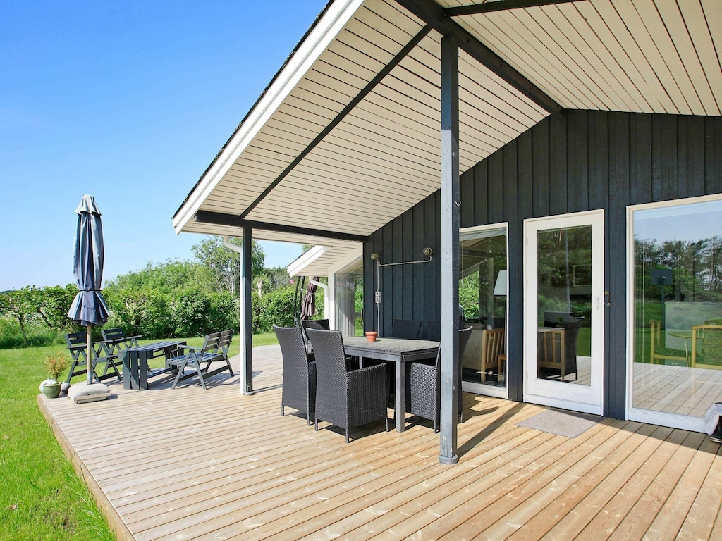Ferienhaus, 94 m² Wohnfläche, 3 Schlafzimmer, 1 Badezimmer, für 6 Personen. offene Küche (Kochherd (elektrisch), Dunstabzugshaube, Kaffeemaschine, Mikrowelle, Spülmaschine, Tiefkühlschrank (1-59L), Kühl-/Gefrierkombination, Waschmaschine), Wohn-/Schlafzimmer (TV (dänische Fernsehsender), DVD-Spieler, CD-Spieler, Stereoanlage, Hochstuhl), Schlafzimmer (Doppelbett, Kinderbett), Schlafzimmer (Doppelbett), Schlafzimmer (Doppelklappbett ), Badezimmer (Fußbodenheizung) (Badewanne oder Dusche, Waschbecken, Toilette), Terrasse, Terrasse (überdacht), Grill, Spielgeräte, Luft-Luft-Wärmepumpe , WiFi.