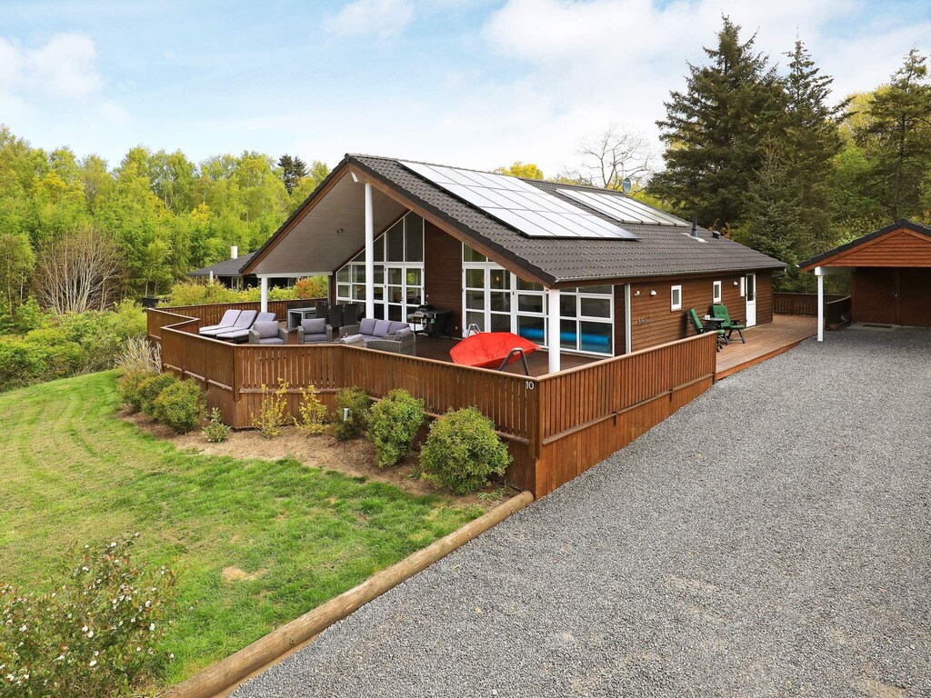 Erhöht gelegenes Ferienhaus mit hauseigenem Swimmingpool, Sauna und herrlicher Aussicht zu Küste und Meer bei Lynderup. Der 12 m² große Innenpool hat einen Schwimmtrainer für die Fitness und bietet an einem Ende Zugang zu einer Sauna für zwei Personen. Vom Poolraum aus haben Sie auch direkten Zugang zur weitläufigen Terrassenfläche. Der geräumige Innenbereich ist luftig gestaltet, mit offener Zimmerdecke bis zum First im großen Küchen-/Wohnbereich für das Familienleben. Zur guten Küchenausstattung gehören auch Cerankochfeld, Kühl-/Gefrierschrank, Dunstabzugshaube und Geschirrspüler. Der Wohnbereich ist mit komfortablem Mobiliar eingerichtet. Im offenen Anschluss daran findet man den Essbereich. Flachbild-TV mit deutschen Sendern sowie WLAN im Haus. Zudem offener Hems oben unter der Dachschräge mit Schlafsofa und zusätzlichem Fernseher mit dänischen Sendern. Im Badezimmer des Hauses gibt es u.a. eine geräumige Dusche und auch eine Waschmaschine. Die Terrassenfläche verläuft einmal um das Haus herum, sodass man zu jeder Tageszeit und bei jeder Windrichtung einen geschützten Sitzplatz im Freien findet. Die Sonne geht an der Rückseite des Hauses auf, wo es einen Zugang zur Küche gibt, und bewegt sich einmal an der Frontseite des Hauses entlang, wo sie bis zum Sonnenuntergang genossen werden kann. Die überdachte Terrasse hat auf beiden Seiten ein schützendes Windsegel, das auch vor Einblicken abschirmt. So bleibt der Aufenthalt im Haus und auf der Terrasse ungestört. Auf der angelegten Rasenfläche gibt es auch eine kleine Feuerstelle für ein Lagerfeuer. Keine Vermietung an Jugendgruppen erwünscht!