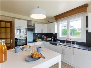 "Reve de Mer", 4-Zimmer-Haus 140 m² auf 2 Stockwerken. Hell, geschmackvoll eingerichtet: Wohn-/Esszimmer mit offenem Kamin, Esstisch und Sat-TV. 1 Zimmer mit 2 Betten. Küche (Backofen, Geschirrspüler, 3 Glaskeramikherd Platten, Toaster, Wasserkocher, Mikrowelle, elektrische Kaffeemaschine) mit kleinem Esstisch. Dusche, sep. WC. Obergeschoss: 1 abgeschrägtes grosses Zimmer mit Panoramafenster mit 1 franz. Bett (160 cm, Länge 200 cm). 1 abgeschrägtes Zimmer mit 1 franz. Bett (140 cm, Länge 190 cm). Bad/WC. E-Heizung. Parkettboden. Terrasse, Südwestlage. Terrassenmöbel, Gartengrill (mobil), Liegestühle (2). Zur Verfügung: Waschmaschine, Kinderhochstuhl, Babybett. Internet (Wireless LAN, gratis). Bitte beachten: Nichtraucher-Haus. 1 Haustier/Hund erlaubt. Rauchmelder.