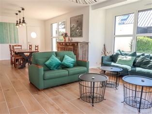 "Ti Le Venez (PLG214)", 5-Zimmer-Haus 125 m² auf 2 Stockwerken. Hell, schön und gemütlich eingerichtet: Wohn-/Esszimmer mit Esstisch. Ausgang zur Terrasse. 1 Zimmer mit 1 franz. Bett (160 cm, Länge 200 cm). Ausgang zur Terrasse. Offene Küche (Backofen, Geschirrspüler, 4 Induktionskochplatten, Toaster, Wasserkocher, elektrische Kaffeemaschine). Dusche, sep. WC. Obergeschoss: (geländerlose Treppe) 1 Zimmer mit 2 Betten (80 cm, Länge 190 cm), E-Heizofen. 2 Zimmer, jedes Zimmer mit 1 franz. Bett (160 cm, Länge 200 cm), E-Heizofen. Dusche, sep. WC, Doppelwaschbecken. Heizung. Parkettböden. Terrasse, Südlage. Terrassenmöbel, Elektrogrill, Liegestühle (2). Zur Verfügung: Waschmaschine, Wäschetrockner, Bügeleisen. Bitte beachten: Nichtraucher-Haus. Rauchmelder. Bei Belegung mit weniger Personen als der maximalen Personenzahl stehen nicht alle Schlafzimmer zur Verfügung.