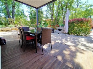 Terrasse (alleinige Nutzung, 80 m2), Gartenmöbel, Liegen, Grill, Pool (Gemeinschaftliche Nutzung mit anderen Gästen, erwärmt, 14 x 6 m., geöffnet von Mai bis einschließlich Sep), Boulebahn , WiFi.