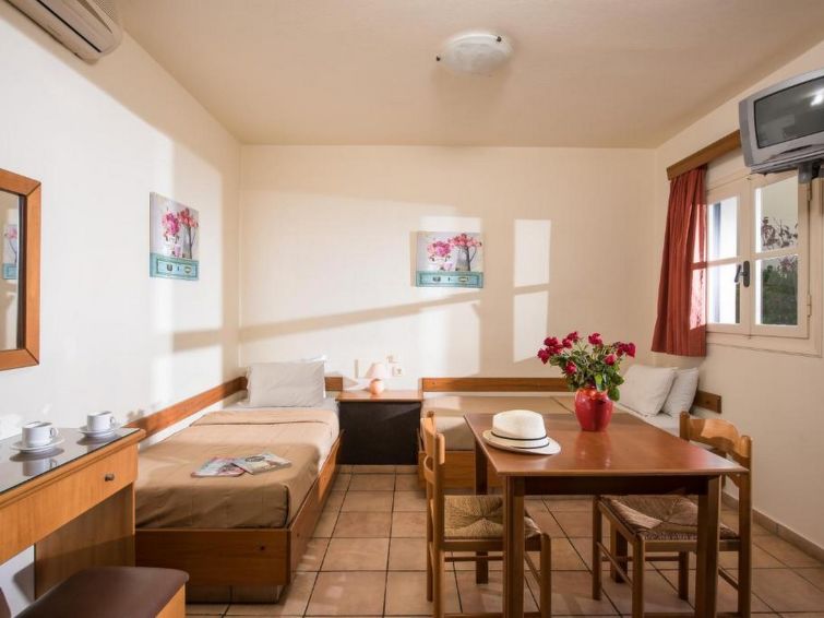 "Dia Studio", 1-Zimmer-Studio 25 m², im Erdgeschoss. Geräumig und hell, komfortabel und schön eingerichtet: offenes Wohn-/Schlafzimmer mit 2 Betten und Sat-TV (Flachbildschirm). Ausgang zur Terrasse. Offene Küche (2 Kochplatten, Toaster, Wasserkocher) mit kleinem Esstisch. Dusche/WC. Klimaanlage. Terrasse. Schöne Sicht auf den Garten. Zur Verfügung: Safe, Bügeleisen, Haartrockner. Internet (Wireless LAN, gratis). Bitte beachten: Nichtraucher-Haus. EL1320-12-2745