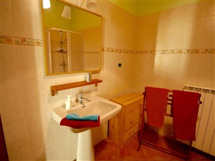 Ferienwohnung / Bauernhaus (Auf einem Bauernhof) , 95 m² Wohnfläche, 2 Schlafzimmer, 2 Badezimmer, für 5 Personen. Parterre: (Eingangshalle (Einzelbett), Wohnzimmer (TV, Kaminofen, Sitzecke, DVD-Spieler), offene Küche (Esstisch, Backofen, Mikrowelle, Kühl-/Gefrierkombination), Schlafzimmer (2x Einzelbett), Schlafzimmer mit Badezimmer (Etagenbett, Dusche, Waschbecken, Toilette, Bidet), Badezimmer (Dusche, Waschbecken, Toilette, Bidet))