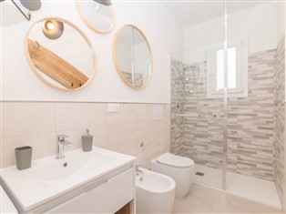 "Azzurra", 3-Zimmer-Wohnung 50 m² im 1. Stock. Sehr schön und modern eingerichtet: Wohn-/Esszimmer. Ausgang zur Terrasse. 1 Doppelzimmer. 1 Zimmer mit 2 Betten. Küche (4 Induktionskochplatten, Toaster, Wasserkocher, Tiefkühler, elektrische Kaffeemaschine, Kombinationsmikrowelle). Bad/Bidet/WC. Klimaanlage. Kleine Terrasse. Terrassenmöbel. Eingeschränkte Sicht auf das Meer. Zur Verfügung: Waschmaschine. Internet (Wireless LAN, gratis). Bitte beachten: geeignet für Familien. Nichtraucher-Haus. R0866
