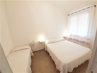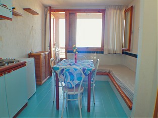 Ferienwohnung (In einer Residenz, Meerblick) , 55 m² Wohnfläche, 2 Schlafzimmer, 1 Badezimmer, für 6 Personen. Parterre: (offene Küche (Kochplatte (elektrisch), Kühlschrank, Waschbecken), Wohn/Esszimmer (Doppelschlafcouch, Esstisch), Schlafzimmer (Doppelbett), Schlafzimmer (Doppelbett oder 2 Einzelbetten), Badezimmer (Dusche, Waschbecken, Toilette, Bidet))