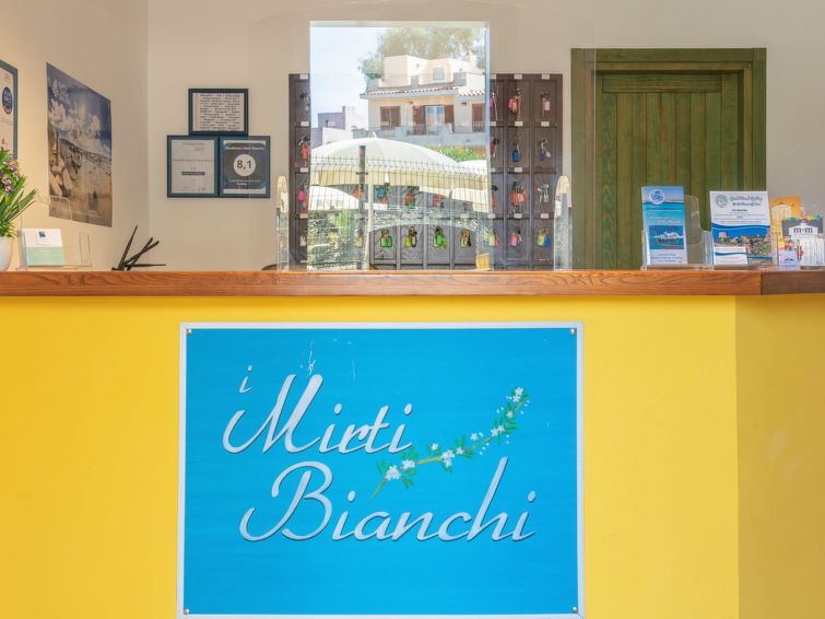 "I Mirti Bianchi - Bilo 2", 2-Zimmer-Wohnung 45 m². Zweckmässig eingerichtet: Wohn-/Esszimmer mit Esstisch und TV. Ausgang zum Balkon. 1 Zimmer mit 1 Doppelbett. Kochnische (4 Induktionskochplatten, Wasserkocher, Mikrowelle). Dusche/WC. E-Heizung, Klimaanlage. Balkon oder Terrasse. Balkonmöbel. Zur Verfügung: Bügeleisen, Kinderhochstuhl, Babybett (extra). Internet (Wireless LAN, gratis). Garage (1 Auto). Bitte beachten: Nichtraucher-Haus. 1 Haustier/Hund erlaubt.