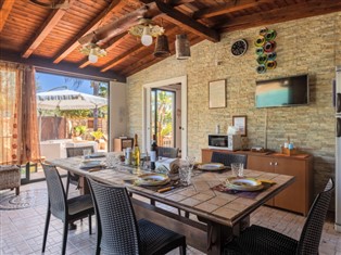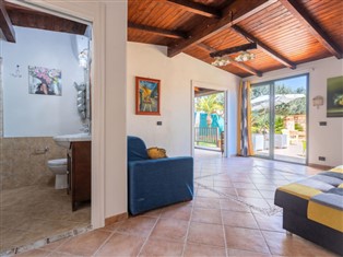 3-Zimmer-Villa 120 m². Komfortabel und geschmackvoll eingerichtet: Wohnzimmer mit 1 Doppeldiwanbett, Klimaanlage und Warmluftheizung. Ausgang zum Schwimmbad. 2 Doppelzimmer, jedes Zimmer mit Sat-TV (Flachbildschirm), Klimaanlage und Warmluftheizung. Grosse Küche (4 Kochplatten, Toaster, Wasserkocher, Mikrowelle, elektrische Kaffeemaschine, Pizzaofen) mit Esstisch, Sat-TV (Flachbildschirm). Ausgang zum Garten, zum Schwimmbad. Dusche/WC. Klimaanlage, Warmluftheizung, Boiler (50 Liter). Terrassenmöbel, Gartengrill, Liegestühle (5). Sicht auf das Schwimmbad und den Garten. Zur Verfügung: Waschmaschine, Bügeleisen, Babybett bis 2 Jahre, Haartrockner. Internet (Wireless LAN, gratis). Parkplatz (1 Auto). 19084001C209734