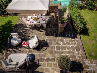 An der Vorderseite der Villa ist eine Terrasse mit Sonnenschirm und Gartenmöbel und auf beiden Seiten gibt es einen Garten mit Liegestühlen. Der Pool befindet sich auf einem niedrigeren Niveau und ist über eine Steintreppe erreicht. Der Pool ist mit römischen Stufen ausgestattet, so dass Sie langsam in den Pool gehen kann. Neben dem Pool ist eine typische Reihe von Zypressen, die Privatsphäre gewährleistet.