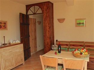 Ferienwohnung / Bauernhaus, 40 m² Wohnfläche, 1 Schlafzimmer, 1 Badezimmer, für 4 Personen. Parterre: (Wohnzimmer (Schlafcouch 1 Pers., Esstisch), offene Küche (Kochplatte, Dunstabzugshaube, Backofen, Kühl-/Gefrierkombination), Schlafzimmer (Einzelbett, Doppelbett, Espressomaschine), Badezimmer (Dusche, Waschbecken, Toilette, Bidet), Babybett)