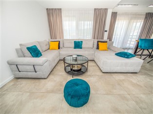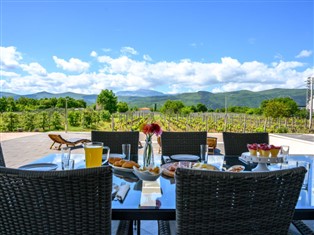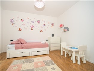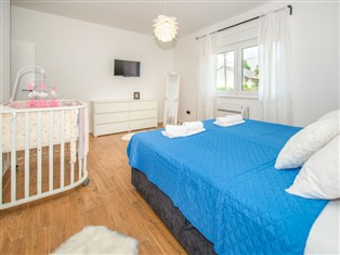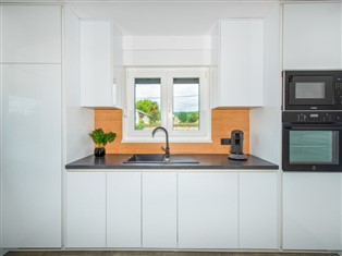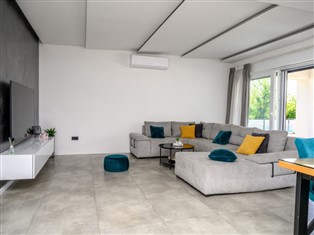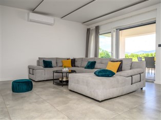 4-Zimmer-Haus 200 m² auf 2 Stockwerken. Modern eingerichtet: Wohn-/Esszimmer mit 1 Doppeldiwanbett (140 cm, Länge 200 cm), TV und Internationale TV-Sender (Flachbildschirm), Klimaanlage. Ausgang zur Terrasse. 1 Zimmer mit 1 franz. Bett (180 cm, Länge 200 cm), Dusche/WC und Sat-TV (Flachbildschirm), Klimaanlage. 1 Zimmer mit 1 franz. Bett (160 cm, Länge 200 cm), Dusche/WC und Sat-TV (Flachbildschirm), Klimaanlage. 1 Zimmer mit 1 Doppelbett (2 x 90 cm, Länge 200 cm). Offene Küche (Backofen, Geschirrspüler, 2 Glaskeramikherd Platten, 2 Induktionskochplatten, Wasserkocher, Mikrowelle, Tiefkühler, elektrische Kaffeemaschine, Kochinsel). Dusche/WC. Bodenheizung. Unteres Geschoss: Spielzimmer. Terrasse 30 m², überdacht. Terrassenmöbel, Liegestühle. Panoramasicht auf die Landschaft. Zur Verfügung: Kinderhochstuhl, Babybett, Haartrockner. Internet (Wireless LAN, gratis).