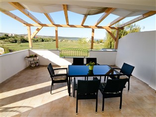 Ferienwohnung (Ländlich) , 55 m² Wohnfläche, 2 Schlafzimmer, 1 Badezimmer, für 4 Personen. Parterre: (offene Küche (Wasserkocher, Toaster, Kochherd (4 Kochplatten, Induktion), Kaffeemaschine, Backofen, Spülmaschine, Kühl-/Gefrierkombination), Wohn/Esszimmer (Doppelschlafcouch (140 x 200 cm), TV (Flatscreen, Satellit), Esstisch (4 Personen), Klimaanlage), Schlafzimmer (Doppelbett (160 x 200 cm)), Schlafzimmer (2x Einzelbett (90 x 200 cm)), Badezimmer (Dusche, Waschbecken, Toilette, Waschmaschine, Föhn), Terrasse (alleinige Nutzung, überdacht, 21 m2), Gartenlounge)