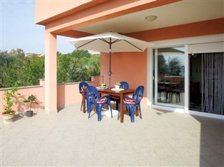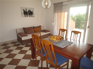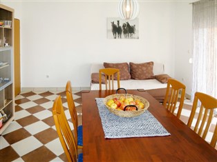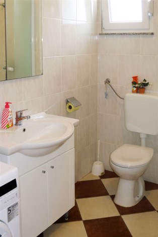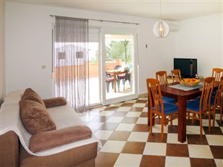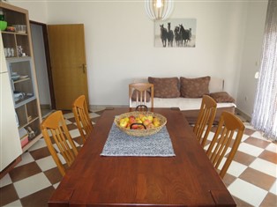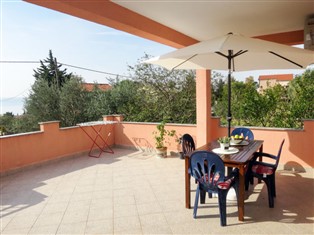 "Tomislav (SRD453)", 3-Zimmer-Wohnung 60 m², im erhöhten Erdgeschoss. Wohn-/Esszimmer mit 1 Doppeldiwanbett (160 cm, Länge 200 cm), Sat-TV und Klimaanlage. Ausgang zur Terrasse. 1 Zimmer mit 2 Betten (90 cm, Länge 200 cm). 1 Zimmer mit 1 franz. Bett (160 cm, Länge 200 cm). Offene Küche (1 Kochplatte, Backofen, 3 Flammen, Toaster, Wasserkocher, Mikrowelle, Tiefkühler, elektrische Kaffeemaschine). Dusche/WC. Keine Heizmöglichkeit. Terrasse 30 m². Terrassenmöbel. Zur Verfügung: Waschmaschine. Internet (Wireless LAN, gratis).