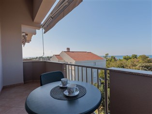 2-Zimmer-Wohnung 40 m² im 2. Stock. Abgeschrägtes Wohn-/Esszimmer mit 1 Diwanbett, Sat-TV und Klimaanlage. Ausgang zum Balkon. 1 Zimmer mit 1 franz. Bett (160 cm, Länge 200 cm). Abgeschrägte, offene Küche (2 Kochplatten, Geschirrspüler, Toaster, Wasserkocher, Mikrowelle, elektrische Kaffeemaschine). Dusche/WC. Balkon 5 m². Balkonmöbel. Sicht auf das Meer. Zur Verfügung: Internet (Wireless LAN). Bitte beachten: Nichtraucher-Haus.