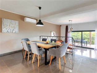 9-Zimmer-Haus 270 m² auf 2 Stockwerken. Schön und geschmackvoll eingerichtet: Wohn-/Esszimmer mit Sat-TV (Flachbildschirm), Klimaanlage. Ausgang zur Terrasse, zum Schwimmbad. 1 Zimmer mit 1 franz. Bett (180 cm, Länge 200 cm), Sat-TV (Flachbildschirm), Klimaanlage. Wohn-/Esszimmer mit Küchenblock und Sat-TV (Flachbildschirm). Ausgang zur Terrasse. 1 Zimmer mit 1 franz. Bett (180 cm, Länge 200 cm). Offene Küche (4 Kochplatten, Backofen, Geschirrspüler, Wasserkocher, Tiefkühler, elektrische Kaffeemaschine). 2 Duschen/WC. Keine Heizmöglichkeit. Obergeschoss: 1 Zimmer mit 1 franz. Bett (180 cm, Länge 200 cm), Bad/WC und Sat-TV (Flachbildschirm), Klimaanlage. 1 Zimmer mit 2 Betten (90 cm, Länge 200 cm), Dusche/WC und Sat-TV (Flachbildschirm), Klimaanlage. Ausgang zur Terrasse. 1 Zimmer mit 1 franz. Bett (180 cm, Länge 200 cm). 2 Zimmer, jedes Zimmer mit 1 Bett (140 cm, Länge 200 cm). Bad/WC. Heizung (extra). Terrasse 20 m², Terrasse 8 m². Terrassenmöbel, Liegestühle. Fernsicht auf das Meer. Zur Verfügung: Safe, Haartrockner. Internet (Wireless LAN, gratis).