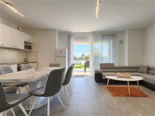 4-Zimmer-Haus 150 m² auf 2 Stockwerken. Geschmackvoll eingerichtet: Wohn-/Esszimmer 28 m² mit Sat-TV (Flachbildschirm), Klimaanlage. Ausgang zur Terrasse. 1 Zimmer mit 1 Doppelbett (2 x 90 cm, Länge 200 cm), Sat-TV (Flachbildschirm), Klimaanlage. Offene Küche (Backofen, Geschirrspüler, 4 Glaskeramikherd Platten, Mikrowelle, Tiefkühler, elektrische Kaffeemaschine). Dusche/WC, Dusche/Bidet/WC. Obergeschoss: 1 Zimmer mit 1 Doppelbett (2 x 90 cm, Länge 200 cm), Dusche/Bidet/WC und Sat-TV (Flachbildschirm), Klimaanlage. Ausgang zur Terrasse. 1 Zimmer mit 1 Doppelbett (2 x 90 cm, Länge 200 cm), Dusche/Bidet/WC und Sat-TV (Flachbildschirm), Klimaanlage. Warmluftheizung. Terrasse 20 m², überdacht, Terrasse 6 m². Terrassenmöbel, Liegestühle. Sicht auf den Garten. Zur Verfügung: Safe, Bügeleisen, Haartrockner. Internet (Wireless LAN, gratis).