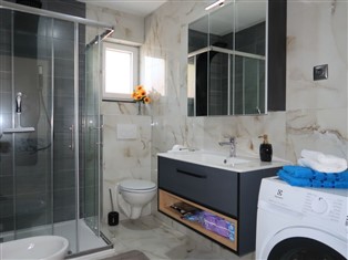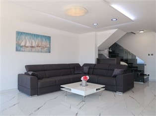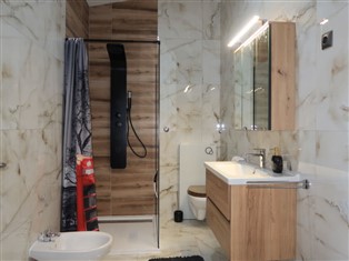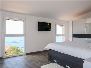 5-Zimmer-Haus 150 m² auf 2 Stockwerken. Wohn-/Esszimmer 40 m² mit Sat-TV und Klimaanlage. Ausgang zur Terrasse. 1 Zimmer mit 1 franz. Bett (160 cm, Länge 200 cm), Sat-TV. Offene Küche (Backofen, 4 Induktionskochplatten, Toaster, Wasserkocher, Mikrowelle, Tiefkühler, elektrische Kaffeemaschine). Dusche/Bidet/WC. Obergeschoss: 1 Zimmer mit 1 franz. Bett (160 cm, Länge 200 cm), Dusche/WC, Sat-TV und Klimaanlage. Ausgang zum Balkon. 1 Zimmer mit 2 Betten (80 cm, Länge 200 cm), Sat-TV und Klimaanlage. Ausgang zum Balkon. 1 Zimmer mit 1 franz. Bett (160 cm, Länge 200 cm), Dusche/WC, Sat-TV und Klimaanlage. Dusche/Bidet/WC. Warmluftheizung. Balkon 6 m², Terrasse 16 m². Terrassenmöbel. Schöne Sicht auf das Meer. Zur Verfügung: Safe, Fliegengitter. Internet (Wireless LAN, gratis). Bitte beachten: Nichtraucher-Haus. Verfügbar: Playstation (inbegriffen).
