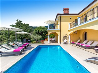 Poljane (Icici) 8 km von Opatija: Kinderfreundliches, schönes Doppelhaus "Villa Orhidea", auf 2 Stockwerken. 5.5 km vom Zentrum von Icici, sonnige, erhöhte Lage, 5.5 km vom Meer, im Grünen. Zur Alleinbenutzung: Rasen 110 m2, Schwimmbad eckig (7 x 3 m, 24 m2, 140 cm tief, saisonale Verfügbarkeit: 20.Apr. - 12.Okt.) mit Innentreppe. Aussendusche, Sprudelbad, Tischtennis, Gartenmöbel, Grill, Kinderspielplatz (Rutschbahn, Schaukel). Im Hause: Internetzugang, Waschmaschine, Wäschetrockner. Parkplatz (für 6 Autos) beim Haus auf dem Grundstück. Einkaufsgeschäft 1.3 km, Restaurant 1.4 km, Bushaltestelle 100 m, Steinstrand 5.5 km, Strandbad 5.5 km, betonierter Strand 5.5 km. Tennis 4 km. Nahe gelegene Sehenswürdigkeiten: Nature park Ucka 8 km. Jugendgruppen nur auf Anfrage. Sprudelbad im Freien, mit Wassertemperatur bis 40 °C.