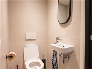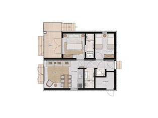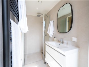 Ferienhaus (Auf Ferienpark) , 69 m² Wohnfläche, 2 Schlafzimmer, 2 Badezimmer, für 6 Personen. Parterre: (offene Küche (Kochplatte, Kaffeemaschine (cups), Kombi-Mikrowelle, Spülmaschine, Kühlschrank), Wohn/Esszimmer (Klimaanlage), Schlafzimmer (2x Einzelbett (Boxspring)), Schlafzimmer mit Badezimmer (Doppelbett oder 2 Einzelbetten (Boxspring), Dusche, Waschbecken), Badezimmer (Dusche (ebenerdige Dusche), Waschbecken), Toilette (Waschbecken), Gartentüren)
