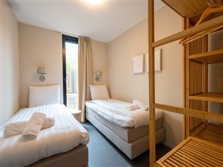 Ferienhaus (Auf Ferienpark) , 69 m² Wohnfläche, 2 Schlafzimmer, 2 Badezimmer, für 6 Personen. Parterre: (offene Küche (Kochplatte, Kaffeemaschine (cups), Kombi-Mikrowelle, Spülmaschine, Kühlschrank), Wohn/Esszimmer (Klimaanlage), Schlafzimmer (2x Einzelbett (Boxspring)), Schlafzimmer mit Badezimmer (Doppelbett oder 2 Einzelbetten (Boxspring), Dusche, Waschbecken), Badezimmer (Dusche (ebenerdige Dusche), Waschbecken), Toilette (Waschbecken), Gartentüren)