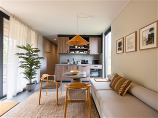 Das schöne Design dieses Luxus-Ferienhauses fügt sich perfekt in die natürliche Umgebung des Resorts ein und liegt zudem am Waldrand. Die Einrichtung und Innenausstattung wurde im gleichen Stil durch die Verwendung natürlicher Materialien und einer hochwertigen Verarbeitung ausgeführt. Auch in praktischer Hinsicht wird es Ihnen an nichts fehlen. Das Wohnzimmer ist voll möbliert und die offene Küche verfügt über alle modernen Geräte. Es gibt insgesamt drei Schlafzimmer und zwei Badezimmer, von denen eines über ein eigenes Badezimmer verfügt. Über eine Leiter erreichen Sie das spezielle dritte Schlafzimmer, wo Sie durch ein Glasdach einen wunderschönen Sternenhimmel genießen können. Vom Hauptschlafzimmer und vom Wohnzimmer haben Sie durch Terrassentüren Zugang zur (überdachten) Terrasse. Außerdem haben Sie eine Klimaanlage, die im Sommer für ein angenehmes Klima sorgt, aber auch im Winter heizt.