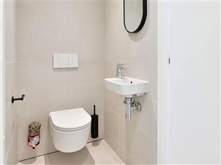 Ferienhaus (Auf Ferienpark) , 49 m² Wohnfläche, 2 Schlafzimmer, 1 Badezimmer, für 4 Personen. Parterre: (offene Küche (Kochplatte, Kaffeemaschine (cups), Kombi-Mikrowelle, Spülmaschine, Kühlschrank), Wohn/Esszimmer, Schlafzimmer (Etagenbett), Schlafzimmer (Doppelbett oder 2 Einzelbetten (Boxspring)), Badezimmer (Dusche (ebenerdige Dusche), Waschbecken), Toilette (Waschbecken))