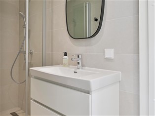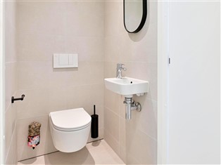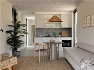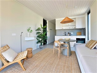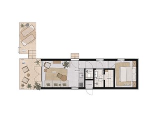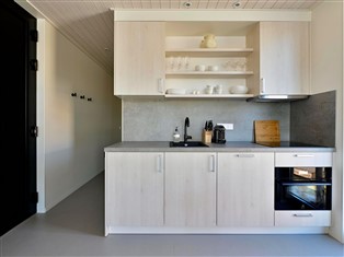 Ferienhaus (Auf Ferienpark) , 49 m² Wohnfläche, 1 Schlafzimmer, 1 Badezimmer, für 2 Personen. Parterre: (offene Küche (Kochplatte, Kaffeemaschine (cups), Kombi-Mikrowelle, Spülmaschine, Kühlschrank), Wohn/Esszimmer (Klimaanlage), Schlafzimmer (Doppelbett oder 2 Einzelbetten (Boxspring)), Badezimmer (Dusche (ebenerdige Dusche), Sauna (alleinige Nutzung), Waschbecken), Toilette (Waschbecken))