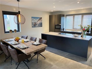 Ferienhaus (Auf Ferienpark, Seeblick) , 150 m² Wohnfläche, 3 Schlafzimmer, 2 Badezimmer, für 6 Personen. Parterre: (Eingangshalle, offene Küche (Esstisch, Kochplatte (Induktion), Wasserkocher, Toaster, Kaffeemaschine (cups), Backofen, Spülmaschine, Kühl-/Gefrierkombination), Wohn/Esszimmer (TV (smart TV), Sitzecke), Toilette (Waschbecken, Toilette))