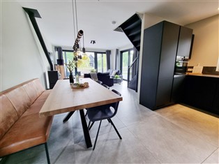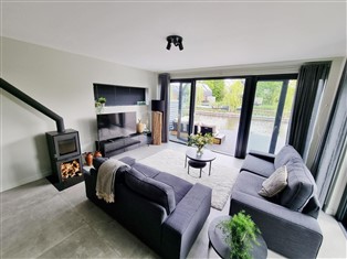 Die offene Küche ist Teil des Wohnzimmers und mit Luxusgeräten ausgestattet. Durch die französischen Türen im Wohnzimmer gelangen Sie bequem in den Garten mit einer schönen Terrasse am Wasser.