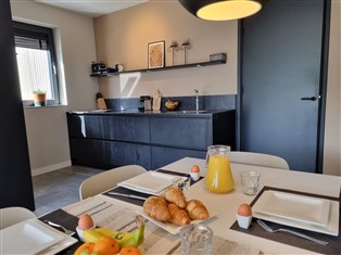 Ferienhaus (Seeblick) , 150 m² Wohnfläche, 4 Schlafzimmer, 3 Badezimmer, für 6 Personen. Parterre: (Eingangshalle, offene Küche (Esstisch, Esstisch, Kochplatte (Induktion), Wasserkocher, Toaster, Kaffeemaschine (cups), Backofen, Spülmaschine, Kühl-/Gefrierkombination), Wohn/Esszimmer (TV (smart TV), Sitzecke), Schlafzimmer mit Badezimmer (Doppelbett (Boxspring), Dusche (ebenerdige Dusche), Waschbecken), Toilette (Waschbecken, Toilette))