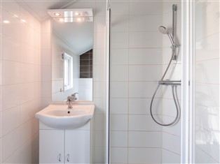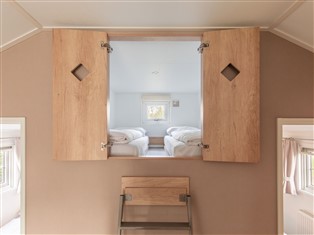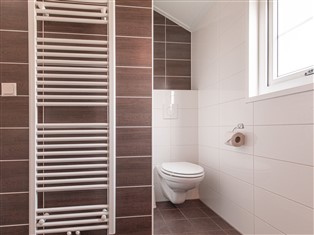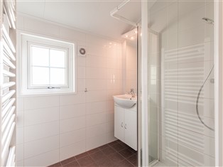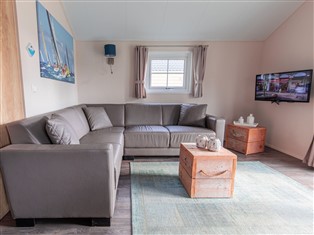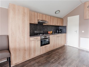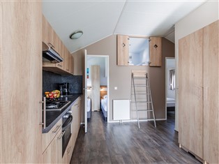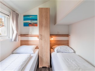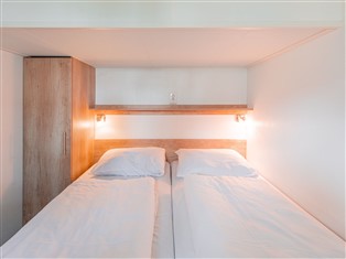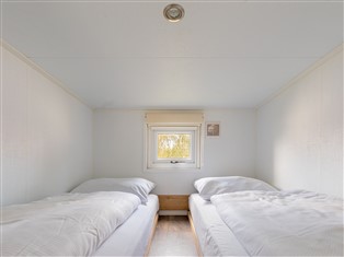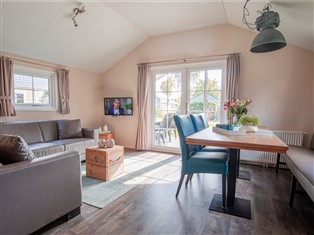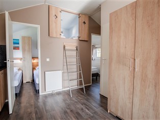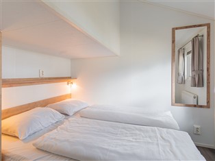 Ferienhaus / Chalet (Auf Ferienpark) , 2 Schlafzimmer, 1 Badezimmer, für 4 Personen. Parterre: (Wohnzimmer (TV), offene Küche (Wasserkocher, Kochherd, Kaffeemaschine (Filter), Kombi-Mikrowelle, Spülmaschine, Kühlschrank (+ Gefrierfach)), Schlafzimmer (Doppelbett (Boxspring)), Schlafzimmer (Einzelbett (Boxspring), Einzelbett (Boxspring)), Badezimmer (Dusche, Waschbecken, Toilette), Empore (über steile Treppe) (Einzelbett, Einzelbett))