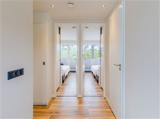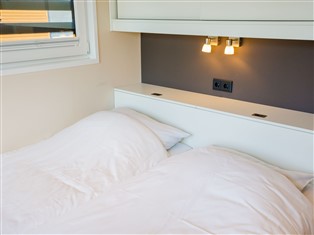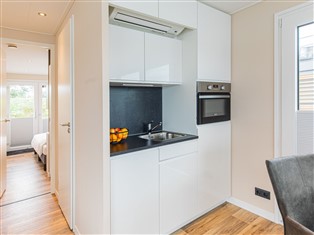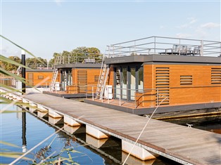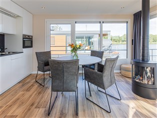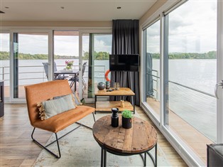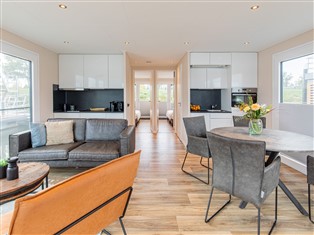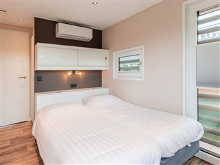 Hausboot (Auf Ferienpark) , 2 Schlafzimmer, 1 Badezimmer, für 4 Personen. Parterre: (Wohnzimmer (TV, Dekokamin), offene Küche (Wasserkocher, Kochherd, Kaffeemaschine (cups), Kombi-Mikrowelle, Spülmaschine, Kühlschrank (+ Gefrierfach)), Schlafzimmer (Doppelbett (Boxspring)), Schlafzimmer (Doppelbett (Boxspring)), Badezimmer (Dusche, Waschbecken, Toilette), Klimaanlage)