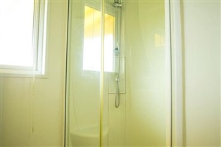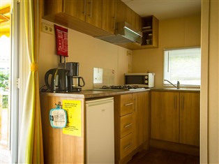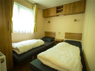 Ferienwohnung / Chalet (Auf Ferienpark) , 36 m² Wohnfläche, 3 Schlafzimmer, 1 Badezimmer, für 5 Personen. Parterre: (offene Küche (Wasserkocher, Kochherd (4 Kochplatten), Kaffeemaschine (Filter), Mikrowelle, Kühlschrank), Wohn/Esszimmer (TV (Kabel)), Schlafzimmer (Doppelbett), Schlafzimmer (Etagenbett), Schlafzimmer (Einzelbett), Badezimmer (Dusche, Waschbecken, Toilette))