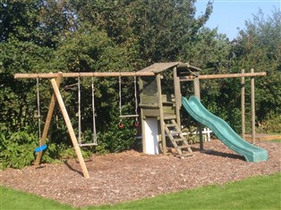 Terrasse (alleinige Nutzung), Garten (alleinige Nutzung, teilweise umzäunt), Gartenmöbel (6 Personen), Grill, Trampolin (Gemeinschaftliche Nutzung mit anderen Gästen), Sonnenschirm, Spielgeräte (Gemeinschaftliche Nutzung mit anderen Gästen), Kinderbett, Hochstuhl , WiFi, Wellnesshaus.