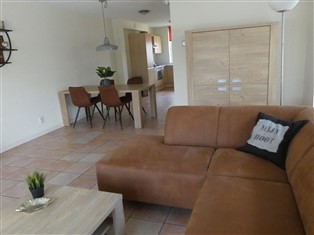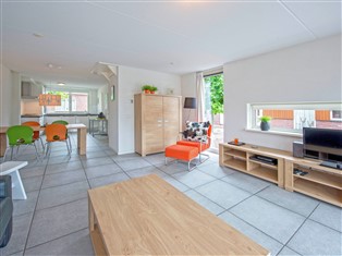 Ferienwohnung (Auf Ferienpark) , 90 m² Wohnfläche, 2 Schlafzimmer, 1 Badezimmer, für 4 Personen. Parterre: (Eingangshalle (Toilette), Wohnzimmer (TV), offene Küche (Kombi-Mikrowelle, Spülmaschine, Kühl-/Gefrierkombination))