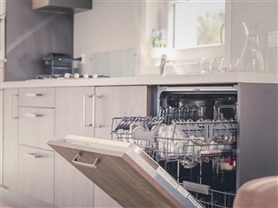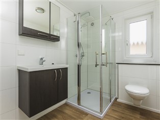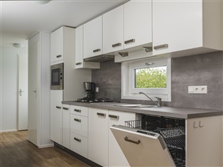 Ferienwohnung / Hütte (Auf Ferienpark) , 65 m² Wohnfläche, 3 Schlafzimmer, 1 Badezimmer, für 6 Personen. Parterre: (offene Küche (Kochherd, Kaffeemaschine, Kombi-Mikrowelle, Spülmaschine, Kühl-/Gefrierkombination), Wohn/Esszimmer (TV (Flatscreen, smart TV)), Schlafzimmer (Doppelbett (Boxspring)), Schlafzimmer (2x Einzelbett (Boxspring)), Schlafzimmer (Etagenbett), Badezimmer (Dusche, Waschbecken, Toilette))