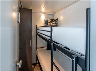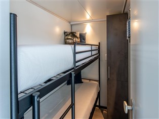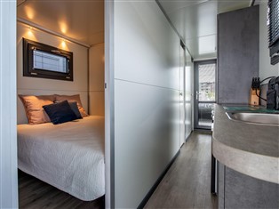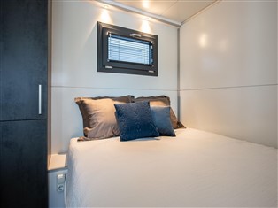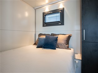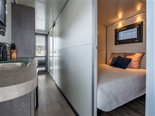 Waterlodge hat folgende Aufteilung: Wohnbereich (Kabine) mit Laminatboden und Fernseher (Digitenne), Küchenbereich (Kombüse) mit elektrischem 2-Flammen-Herd, Kombi-Mikrowelle und Kühlschrank mit Gefrierfach. Das Hauptschlafzimmer (Kabine 1) verfügt über ein Doppelbett (1,60 m breit) mit Doppeldecke, einen Schrank und einen Safe. Das Kinderzimmer (Kabine 2) hat ein Etagenbett und Stauschränke. Das Badezimmer ist luxuriös und mit Dusche, Waschbecken und Toilette ausgestattet.