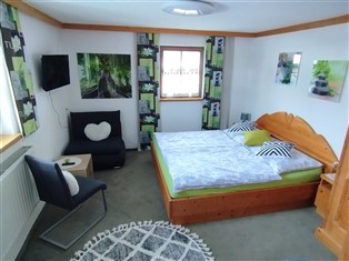 Ferienwohnung (In einem Wohngebiet oder im Zentrum (Dorf)) , 45 m² Wohnfläche, 1 Schlafzimmer, 1 Badezimmer, für 3 Personen. Parterre: (Wohnzimmer (TV), offene Küche (Kochherd (2 Kochplatten), Kaffeemaschine, Mikrowelle, Kühlschrank), Schlafzimmer (Schlafcouch 1 Pers., Doppelbett, TV), Badezimmer (Dusche, Waschbecken, Toilette))