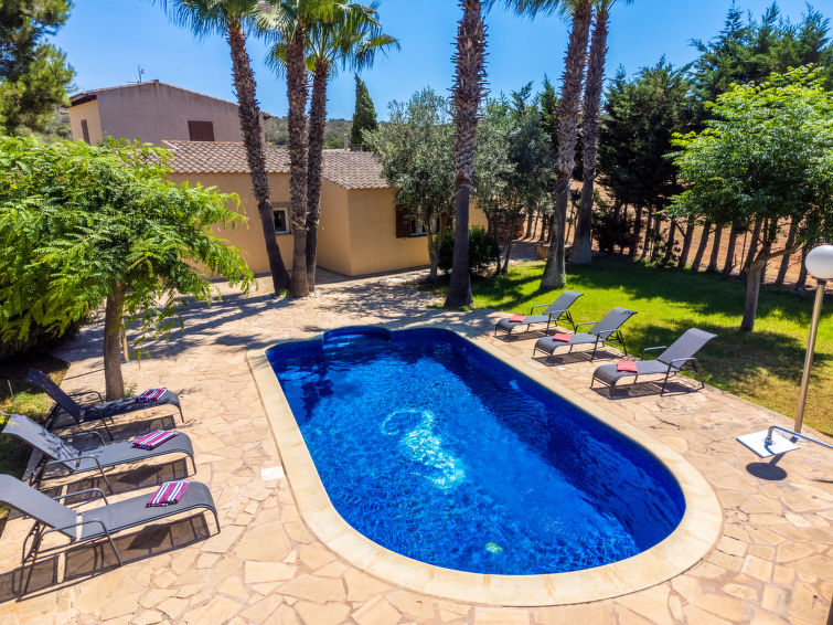 "Sa Vinya (SSS111)", 4-Zimmer-Haus 130 m². Geschmackvoll eingerichtet: Wohn-/Esszimmer mit offenem Kamin (nur Deko), Esstisch, Sat-TV, Digital-TV, Radio und CD. Ausgang zur Terrasse. 1 Zimmer mit 1 franz. Bett (1 x 150 cm), Ventilator. 1 Zimmer mit 1 franz. Bett (1 x 150 cm), Dusche/WC und Ventilator. 1 Zimmer mit 2 Betten und Ventilator. Offene Küche (Backofen, Geschirrspüler, 3 Glaskeramikherd Platten, Toaster, Mikrowelle, Tiefkühler, elektrische Kaffeemaschine). Dusche/WC. Ölheizung. Terrasse überdacht. Terrassenmöbel, Gartengrill, Liegestühle. Zur Verfügung: Waschmaschine, Bügeleisen, Fliegengitter, Kinderhochstuhl, Babybett, Haartrockner. Internet (Wireless LAN, gratis). Bitte beachten: Nichtraucher-Haus. Feuerlöscher. ETV2372