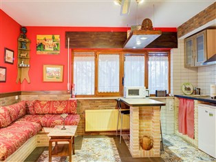 Ferienwohnung / Hütte (In einem Wohngebiet oder im Zentrum (Dorf)) , 45 m² Wohnfläche, 1 Schlafzimmer, 1 Badezimmer, für 2 Personen. Parterre: (offene Küche (Toaster, Kochherd (2 Kochplatten, elektrisch), Kaffeemaschine (Filter), Mikrowelle, Kühl-/Gefrierkombination), Wohn/Esszimmer (TV (Flatscreen, digital), Esstisch, Sitzecke), Schlafzimmer (Doppelbett (150 x 190 cm)), Badezimmer (Dusche, Waschbecken, Toilette), Heizung)