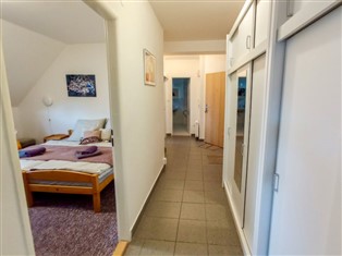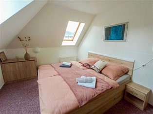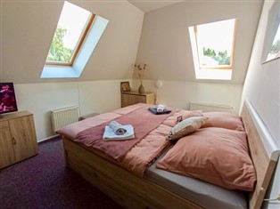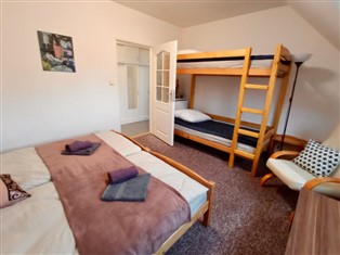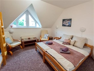 "Nový svet, Harrachov", 2-Zimmer-Wohnung 61 m², im Dachgeschoss. Modern eingerichtet: abgeschrägtes Wohn-/Schlafzimmer mit 1 Diwanbett, 1 Doppelbett und TV. Ausgang zum Balkon. 1 abgeschrägtes Zimmer mit 2 Betten und 1 x 2 Etagenbetten. Küche (2 Kochplatten, Wasserkocher, Mikrowelle, elektrische Kaffeemaschine) mit Esstisch. Bad/WC. Kleiner Balkon 1 m². Sicht auf die Berge und die Ortschaft. Zur Verfügung: Internet (Wireless LAN, gratis). Geeignet für Familien. Haustiere sind nicht erlaubt.