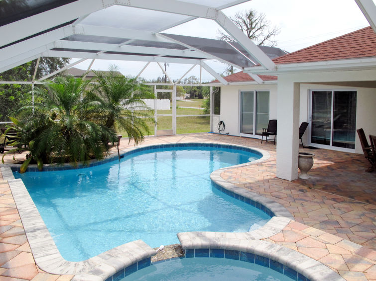 Das Ferienhaus liegt im westlichen Teil von Cape Coral. Nächstes Einkaufszentrum und Restaurants 5 km. Zum kleinen Sandstrand beim Jachtclub 14 km. Das Haus steht auf einem ca. 900 m² großen, offenen Rasengrundstück mit elektrisch beheizbarem Pool (7 x 3,5 m, geschwungene Form, Screen, ganzjährig geöffnet), Hottub (ohne Düsen, getrennt beheizbar) sowie großer, nach Südosten ausgerichteter teilüberdachter Terrasse mit Mobiliar, Sonnenliegen und Gasgrill. Garage. Ansprechende Einrichtung. Fliesen- und Teppichboden. 4x Kabel-TV. Internetzugang (WLAN, inklusive). Waschmaschine, Trockner, Bügeleisen/?-brett. Klimaanlage mit Kühl-/?Heizfunktion. Hinweis: Rauchen ist im Haus nicht gestattet." komfortables Einfamilienhaus "Fresh Water". 5 km vom Zentrum von Cape Coral, 20 km vom Zentrum von Fort Myers, 252 km vom Zentrum von Miami, 8 km vom Meer. Zur Alleinbenutzung: Grundstück 900 m2 mit Rasen, Schwimmbad nierenförmig, beheizt (7 x 3 m, saisonale Verfügbarkeit: 01.Jan. - 31.Dez.). Sprudelbad, Einzelgarage. Einkaufsgeschäft 5 km, Sandstrand 15 km. Jacht-Hafen 15 km.